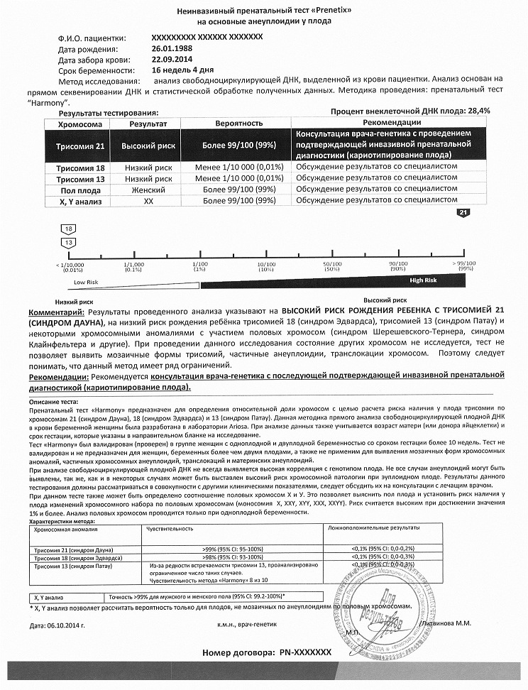 Отчет содержит четкий, легко интерпретируемый результат о наличии высокого или низкого риска хромосомной аномалии.